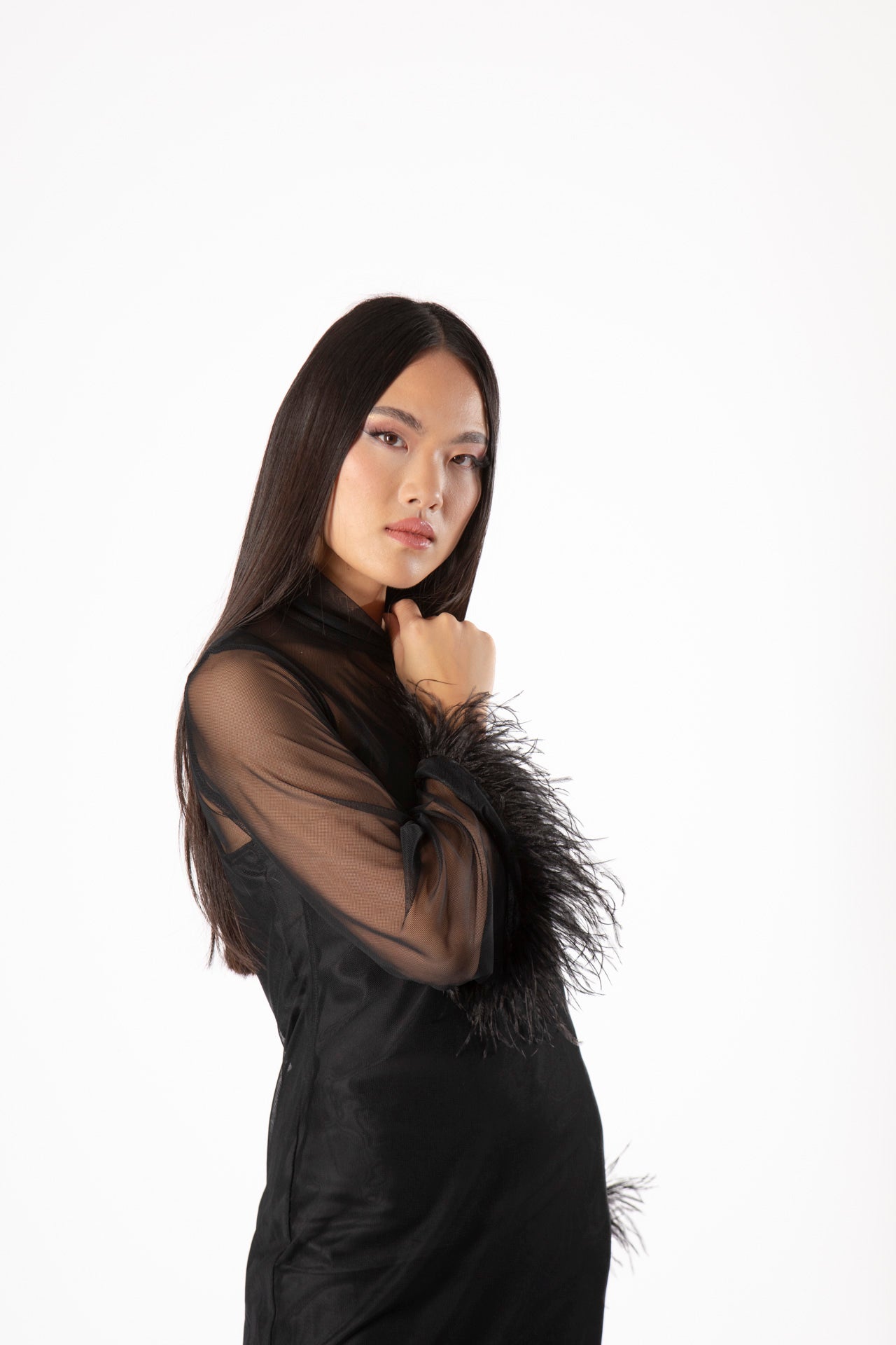 Abito mini con collo alto e trasparenze. Caratterizzato da piume sulle maniche e sul fondo del vestito. Vestibilità regolare. Dona eleganza al tuo look.