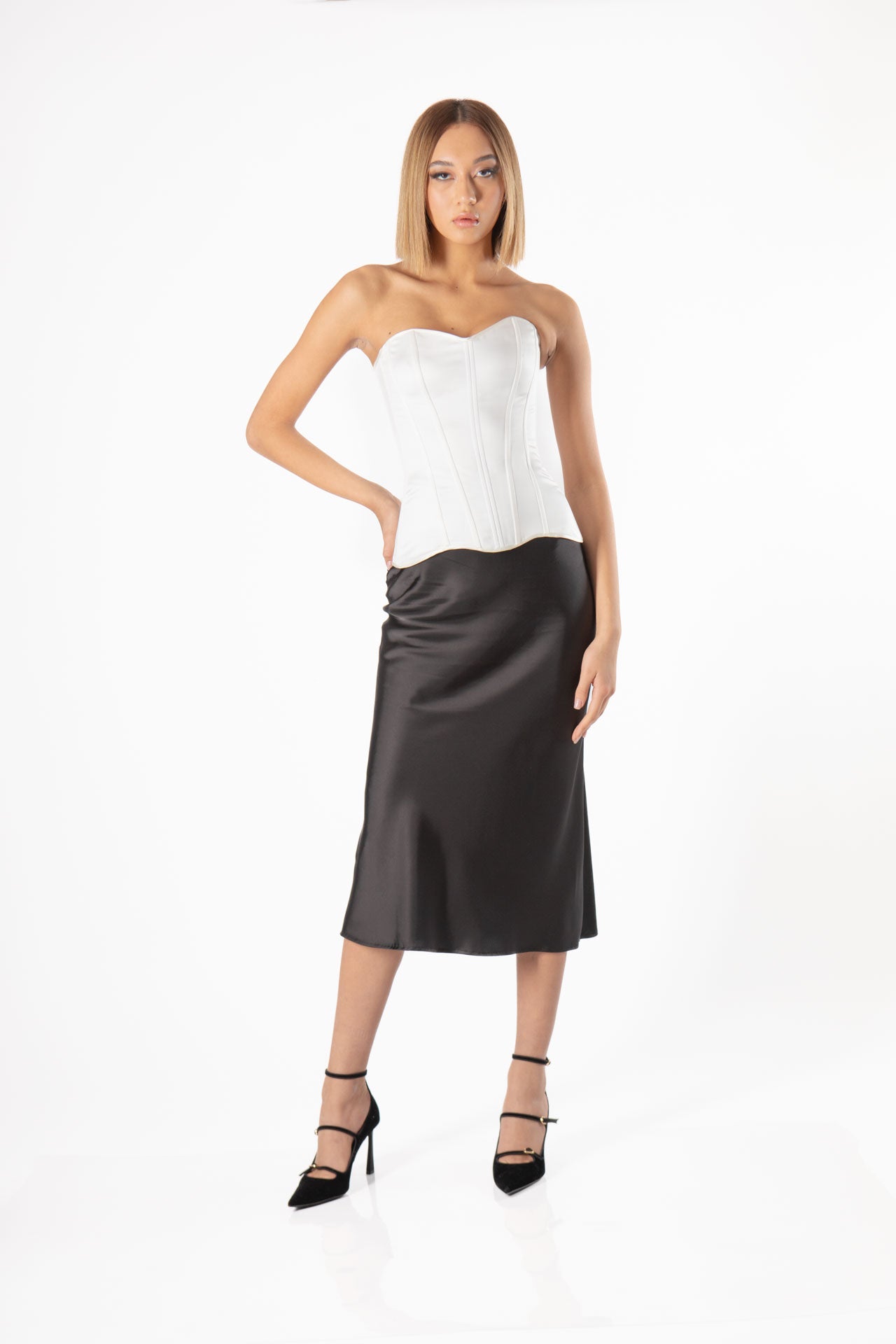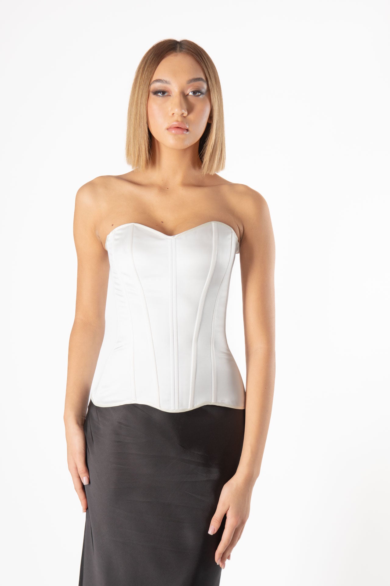Il corsetto Kseniya: bianco senza push-up è un capo elegante e seducente ideato per valorizzare il décolleté e modellare la figura. Il colore bianco conferisce al corsetto un aspetto raffinato e versatile, adatto per occasioni speciali o per aggiungere un tocco di sensualità all'abbigliamento quotidiano. La chiusura sul retro, con gancetti e lacci, consente un'adeguata regolazione per adattarsi alla forma del corpo. Il corsetto bianco è un prodotto ideale per chi desidera un look femminile, elegante e seducente.