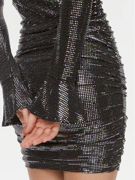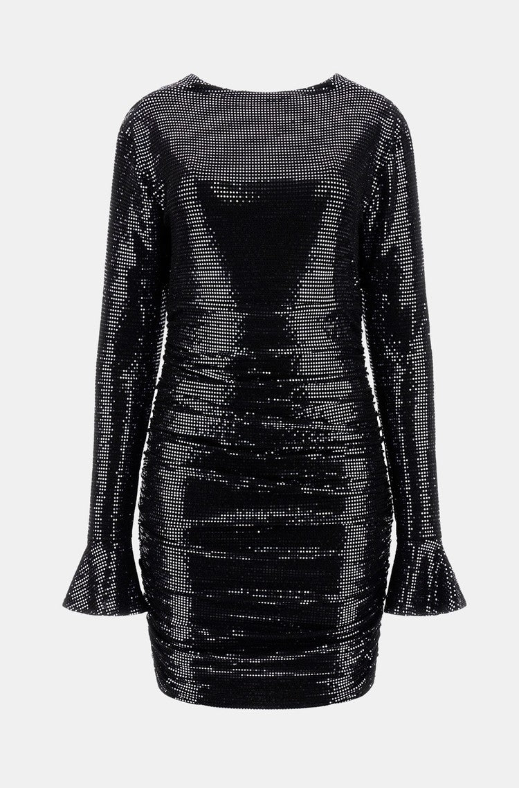 Abito corto GUESS dal design reversibile, realizzato in tessuto con micro paillettes grigio glamour che riflettono la luce con eleganza.