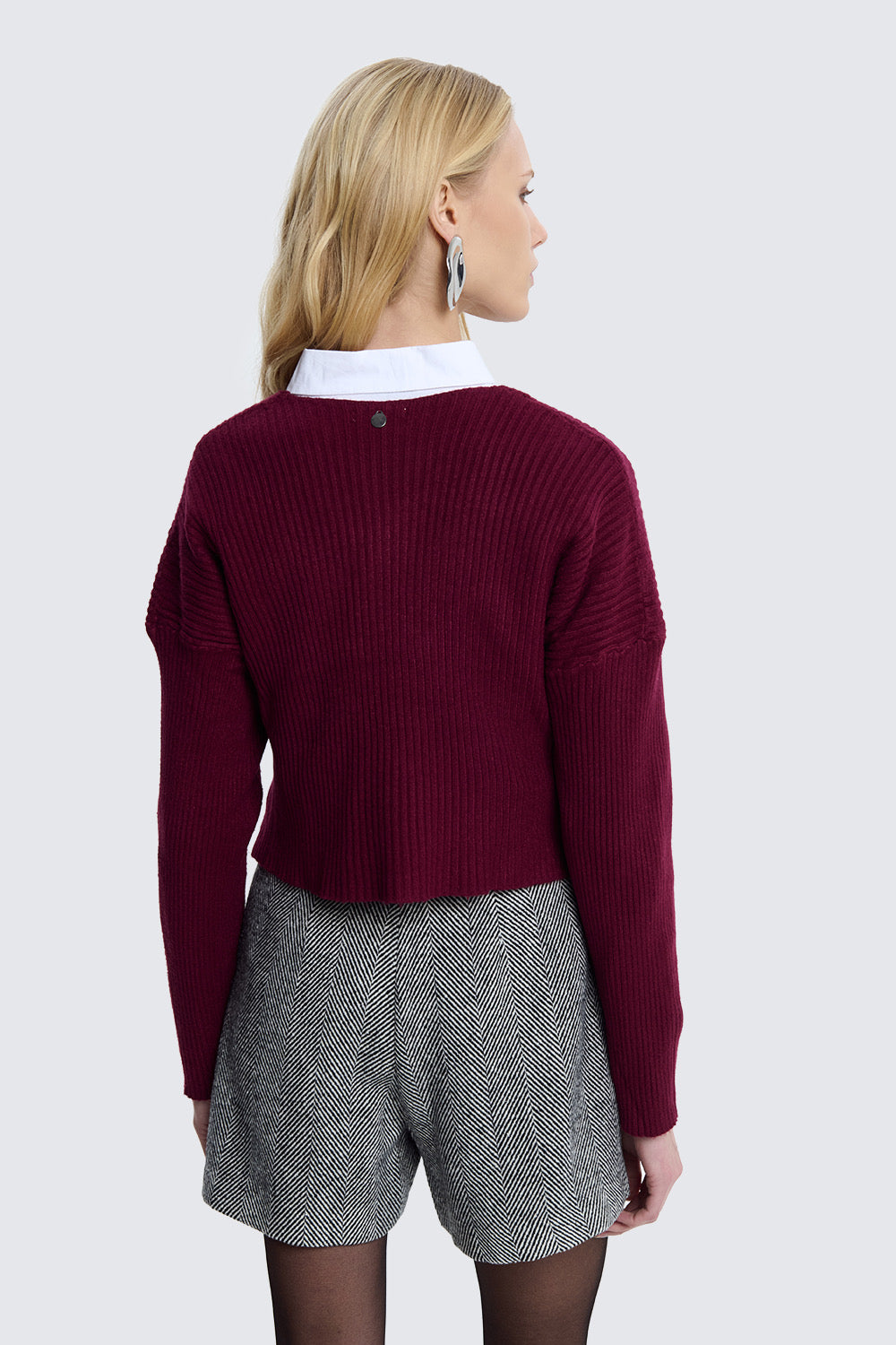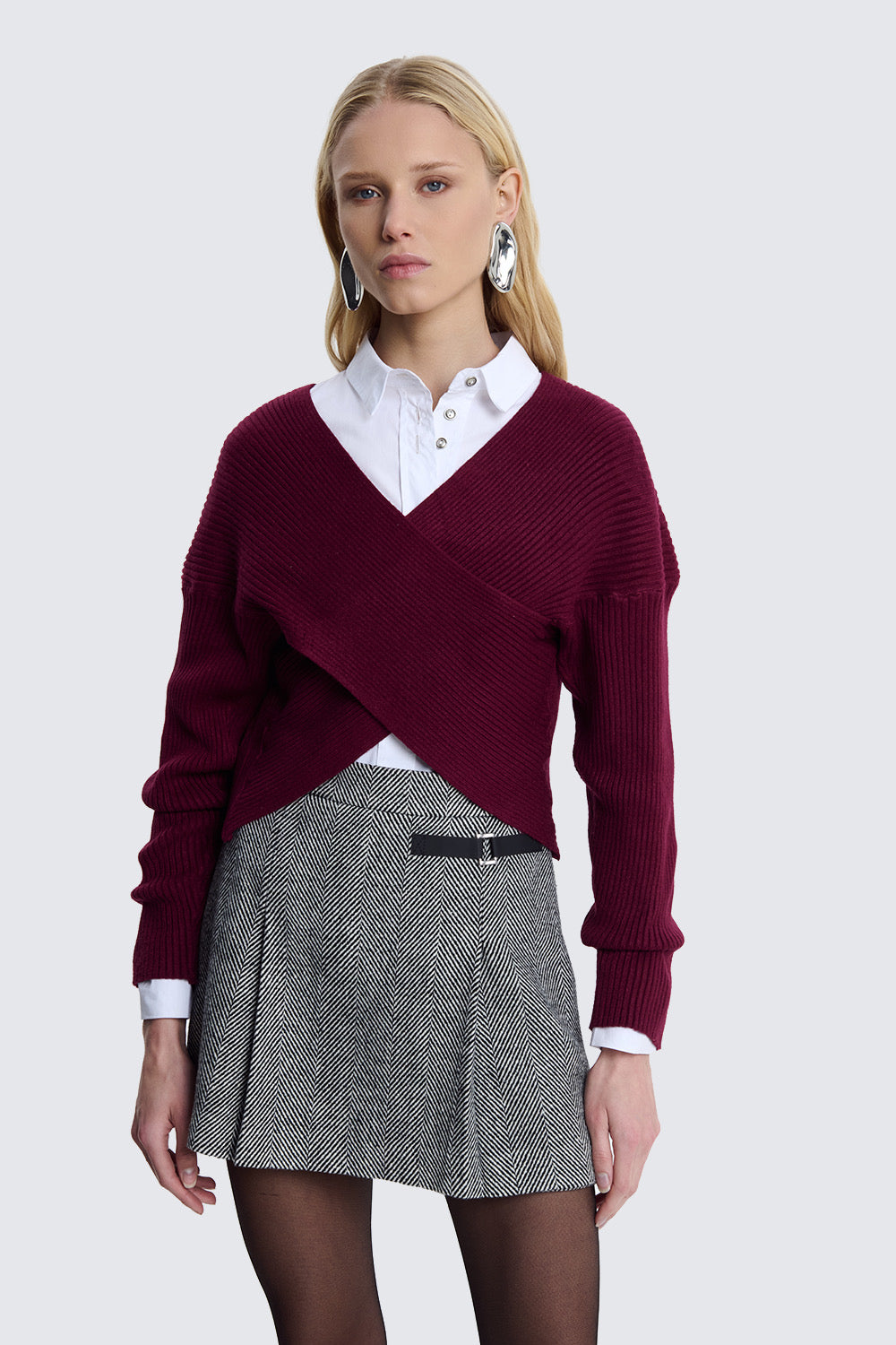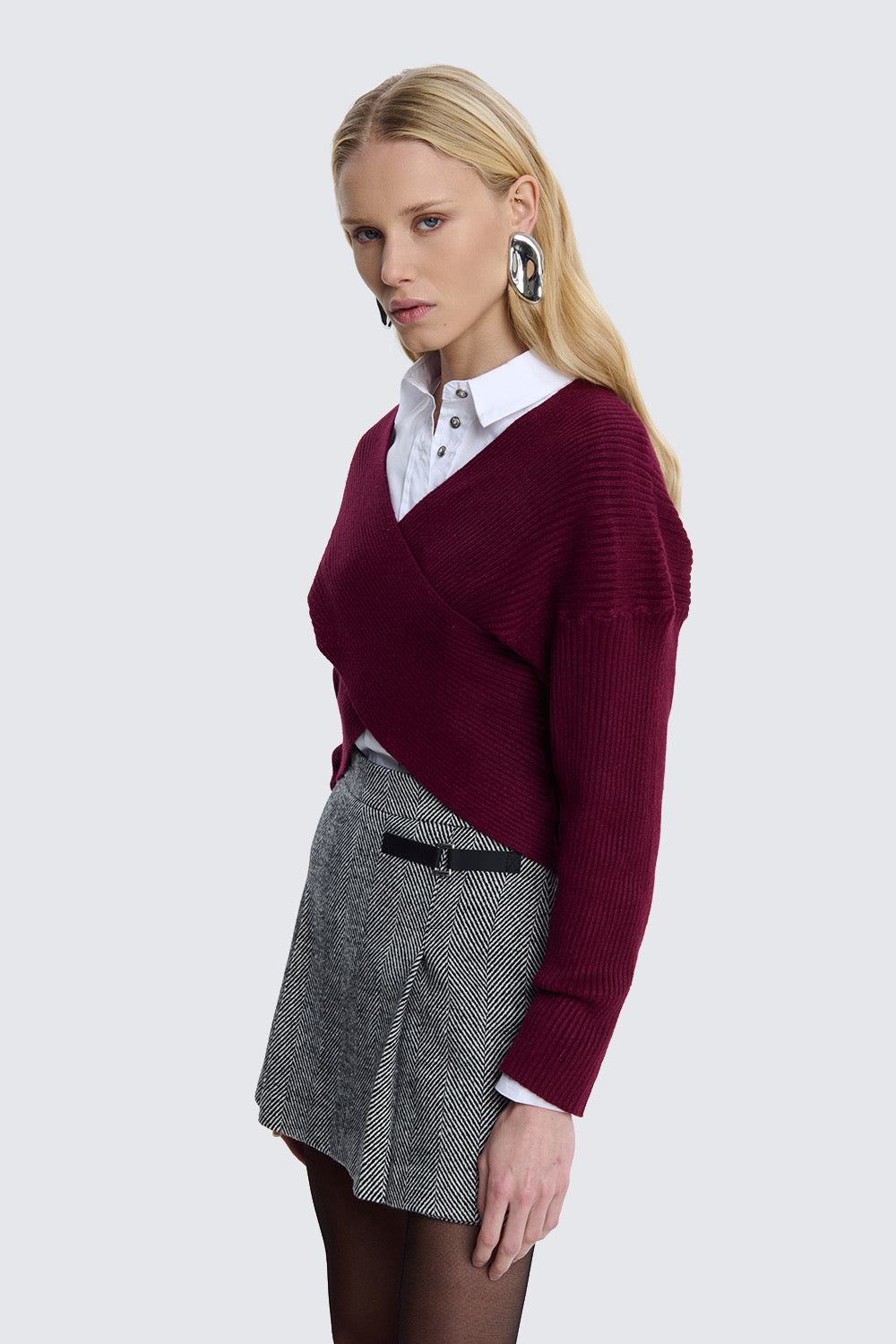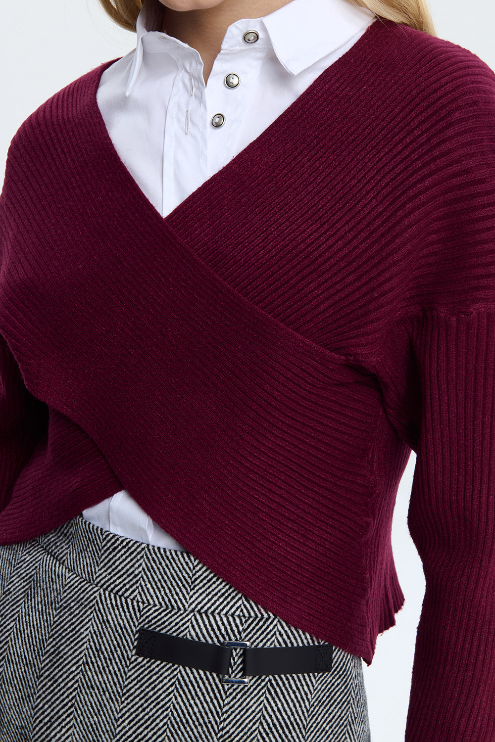 Il maglioncino incrociato in colore bordeaux è un modello femminile e moderno, pensato per valorizzare la silhouette con eleganza.