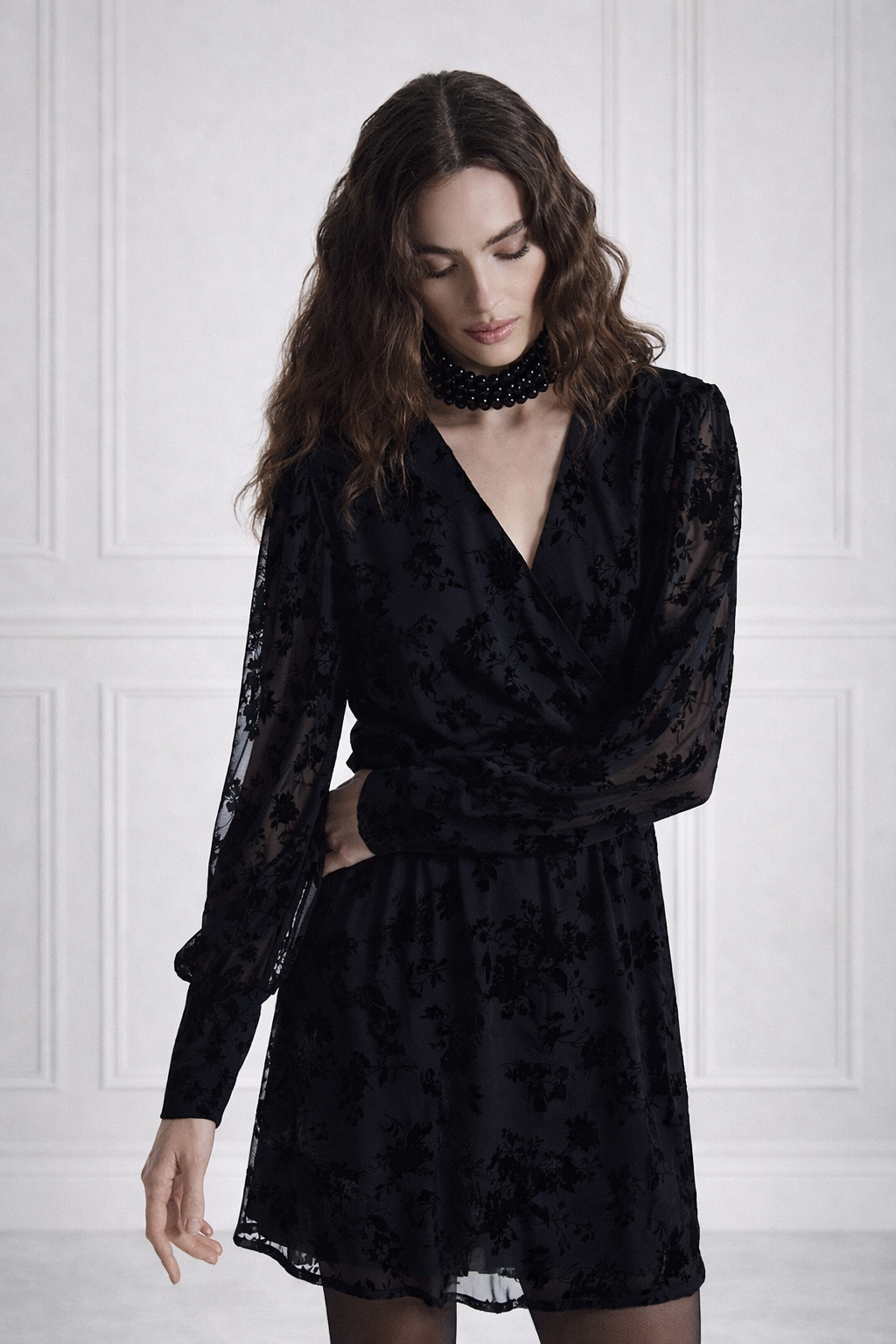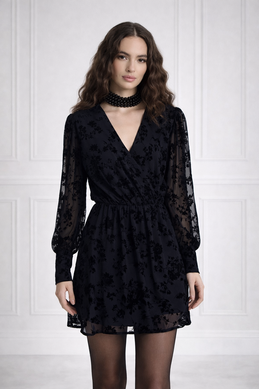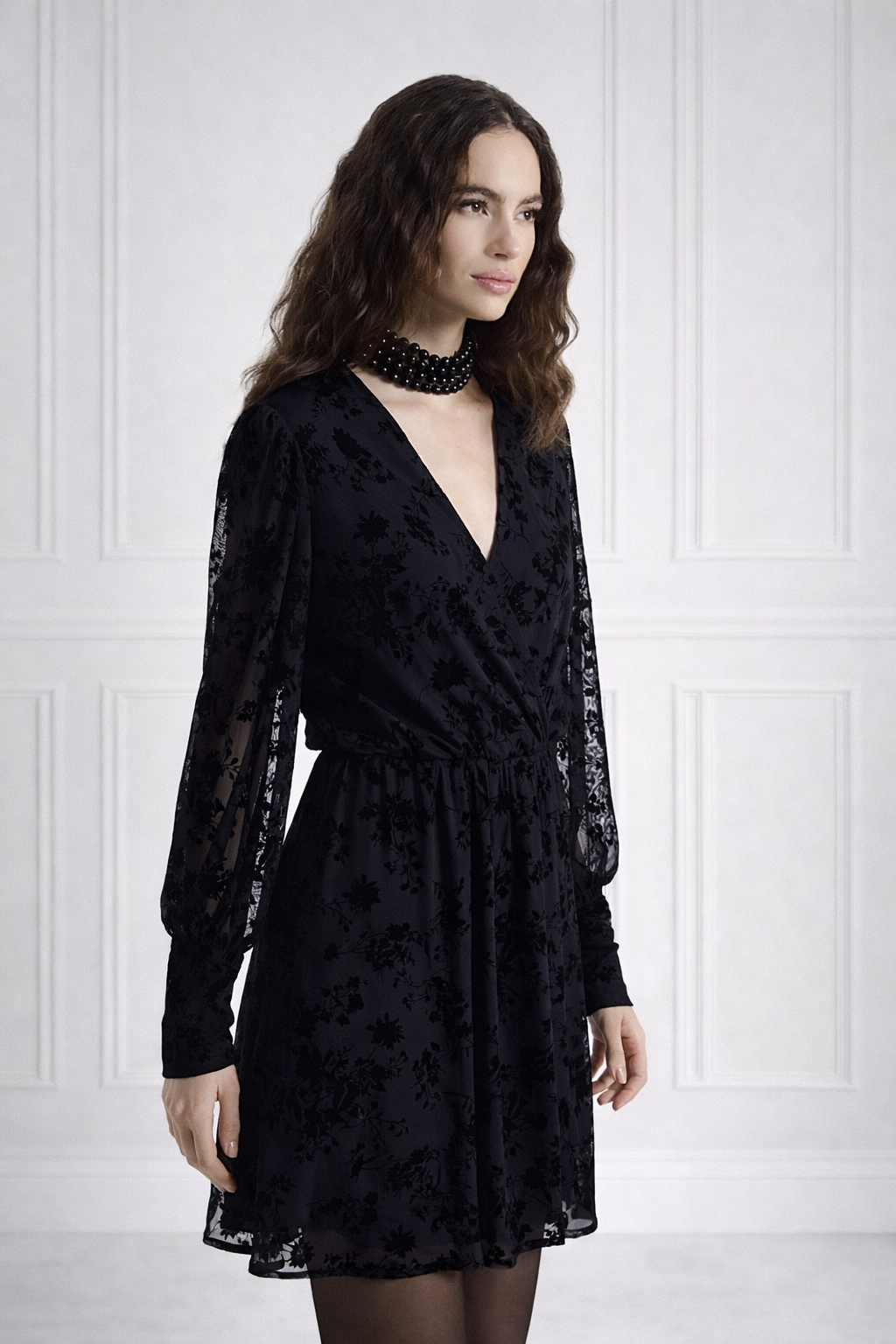 Abito corto in tessuto devoré nero dal fascino sofisticato e femminile.