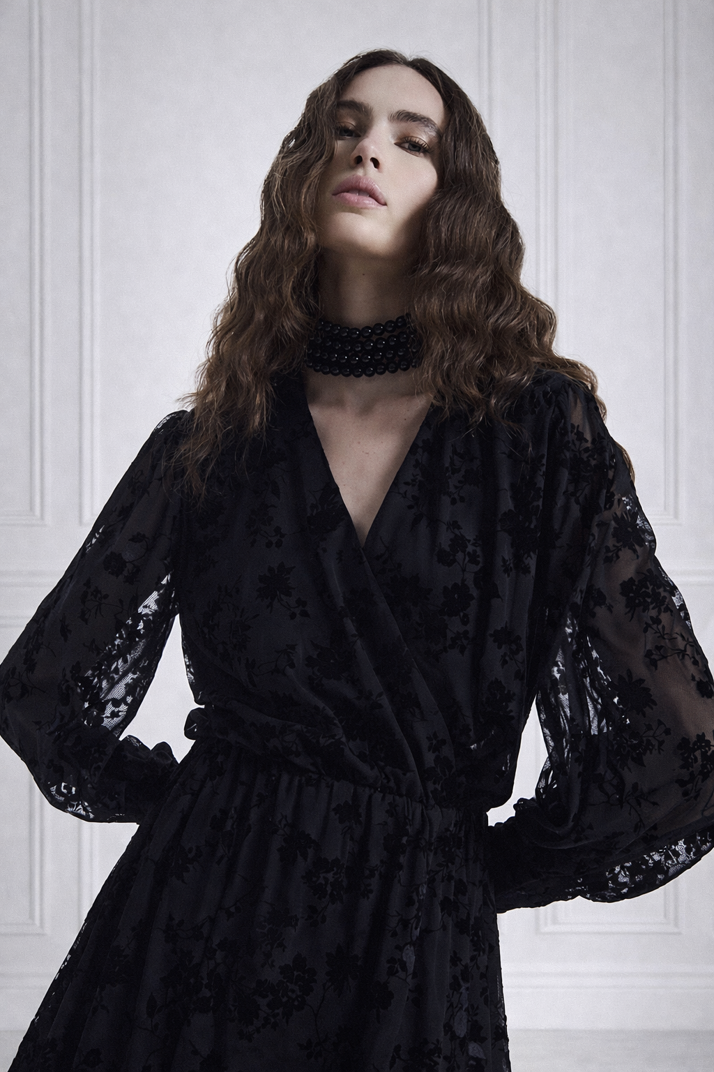 La lavorazione a motivo floreale tono su tono crea un raffinato gioco di trasparenze, mentre lo scollo a V incrociato valorizza il décolleté con eleganza.