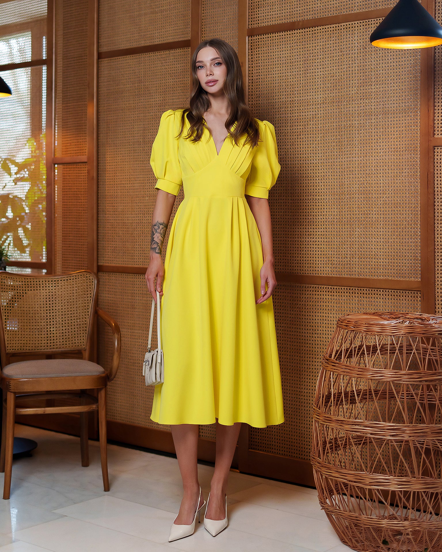 Abito giallo midi con maniche a sbuffo e scollo drappeggiato